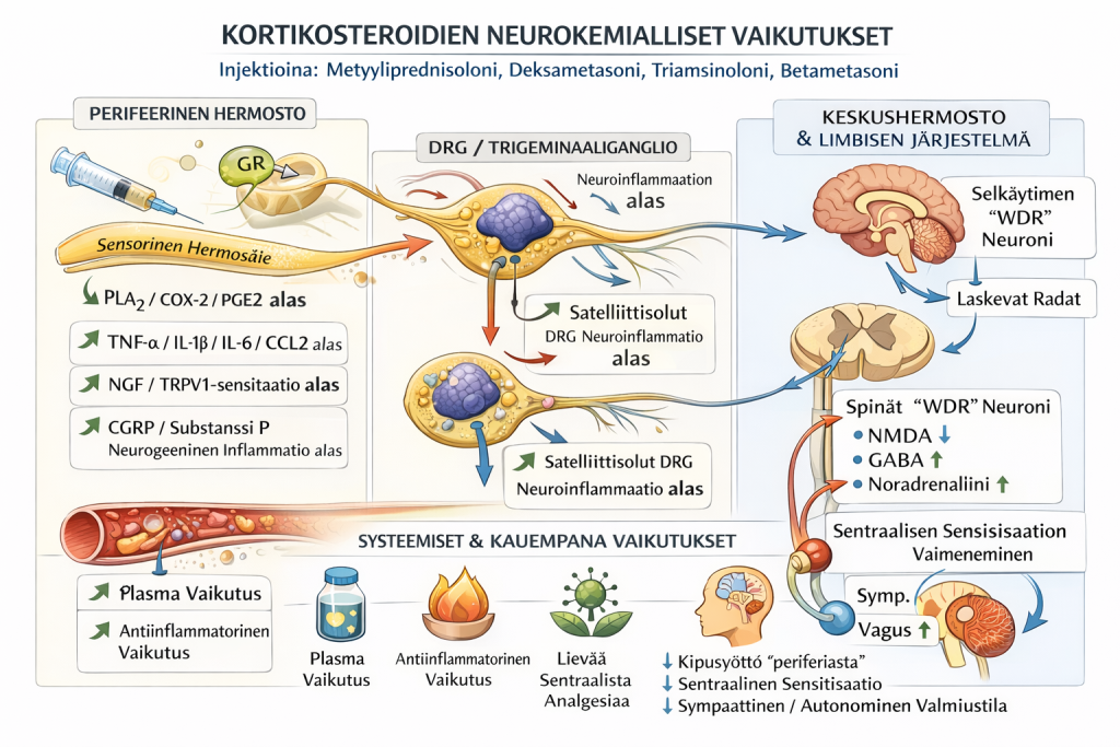 Kortikosteroidi ei ole ensisijaisesti “kipulääke” vaan afferenttia kuormaa pienentävä ympäristöinterventio, joka voi pidentää vasteen kestoa.
