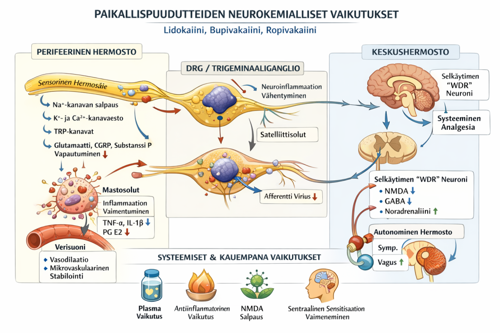 Ensisijainen vaikutus on jänniteherkkien natriumkanavien (Nav) toiminnan vaimeneminen ja siten hermoimpulssin syntymisen/etenemisen heikentyminen. Kliinisen ilmiön kannalta olennaista ei ole vain “johtokatkos”, vaan myös: