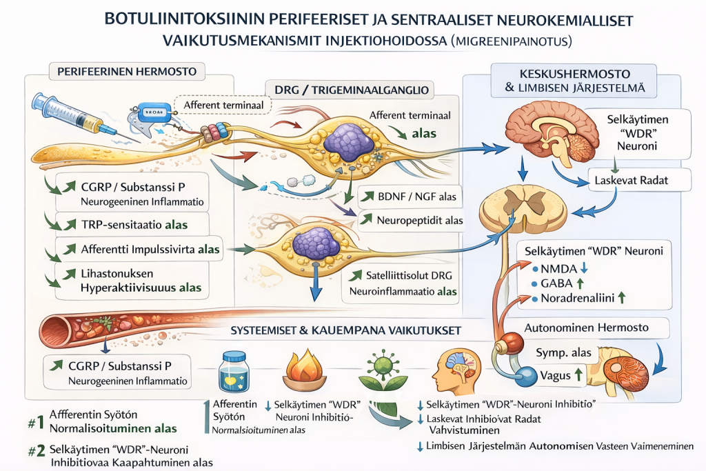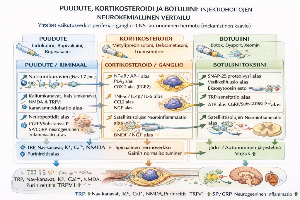 Perifeeristen injektiohoitojen (paikallispuudutteet, kortikosteroidit, botuliinitoksiini) kliininen erityispiirre on se, että vaikutus ei aina rajoitu anatomiseen pistosalueeseen. Monilla potilailla havaitaan nopea muutos sekä kivussa että autonomisissa ja sensorisissa ilmiöissä (valo-/ääniherkkyys, pahoinvointi, “kirkastuminen”, rintakehän/vatsan jännitys, liikerajoituksen laukeaminen). Nämä ilmiöt voidaan jäsentää yhtenäiseksi ketjuksi, jossa afferentin syötön normalisoituminen vähentää sensitaatiota useilla hermoston tasoilla.